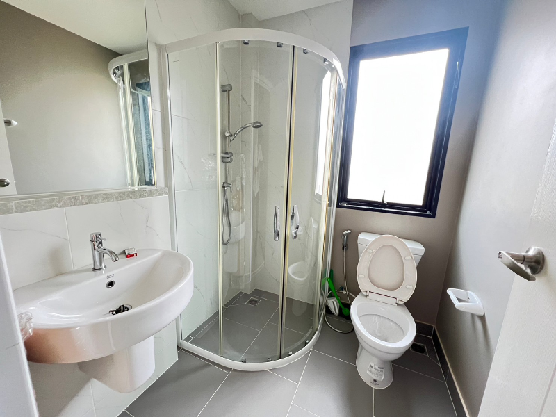 พื้นด้านล่างปูด้วยกระเบื้องแกรนิตโต้ 60*60 พื้นและผนังห้องน้ำ