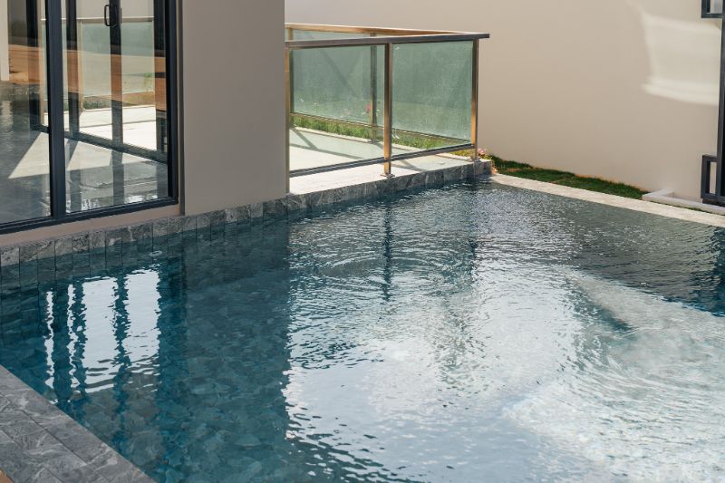 ห้องนั่งเล่นเชื่อมต่อกับสระว่ายน้ำ