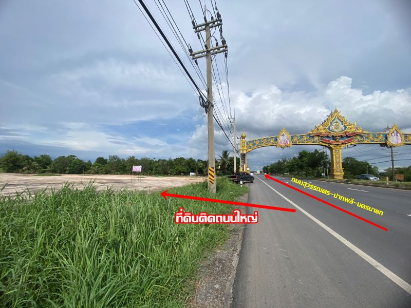 紧急出售土地,9-1-2.5 rai,毗邻 Suwannasorn-Pak Phli-Nakhon Nayok 路的 4 车道公路。