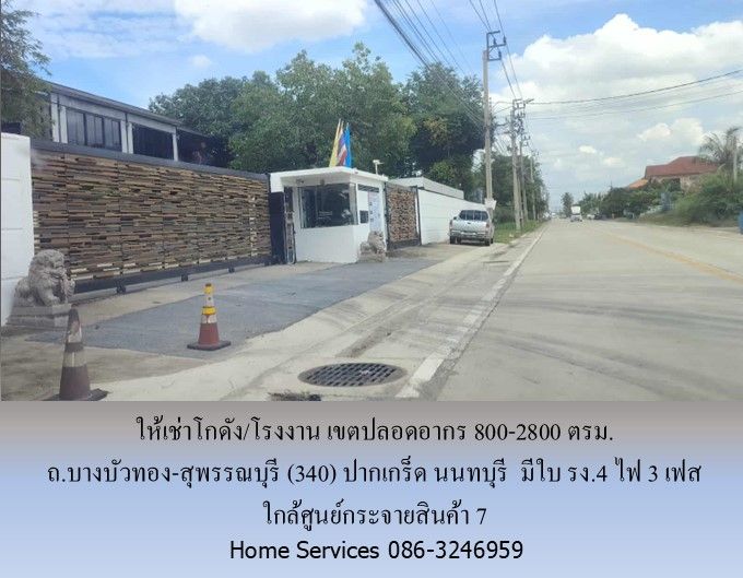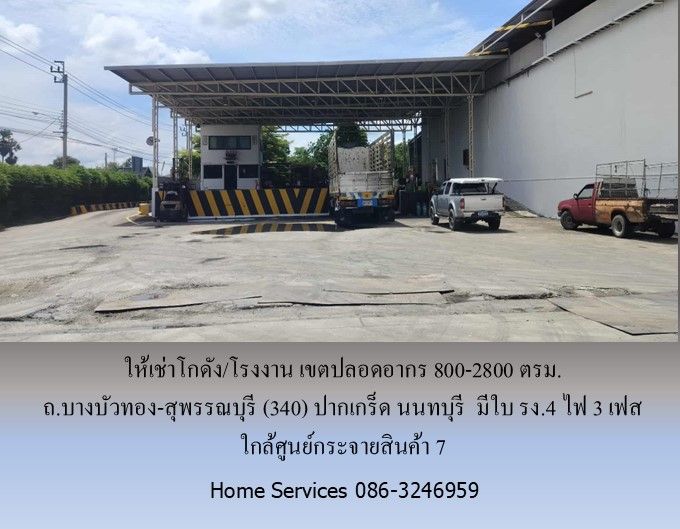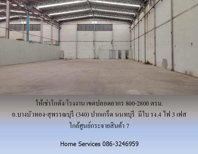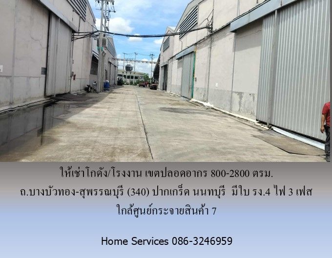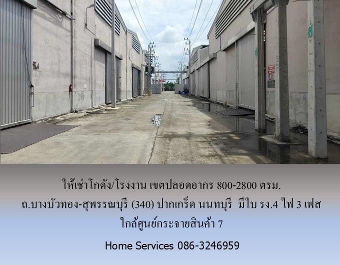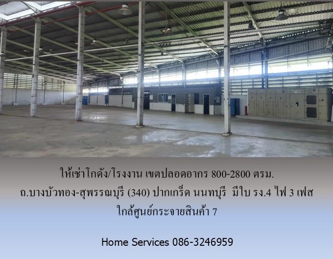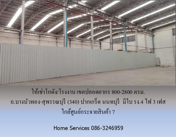 ให้เช่าโกดัง/โรงงาน เขตปลอดอากร ถ.บางบัวทอง-สุพรรณบุรี (340) ปากเกร็ด นนทบุรี 800-2800 ตรม. มีใบ รง.4 ไฟ 3 เฟส ใกล้ศูนย์กระจายสินค้า 7
