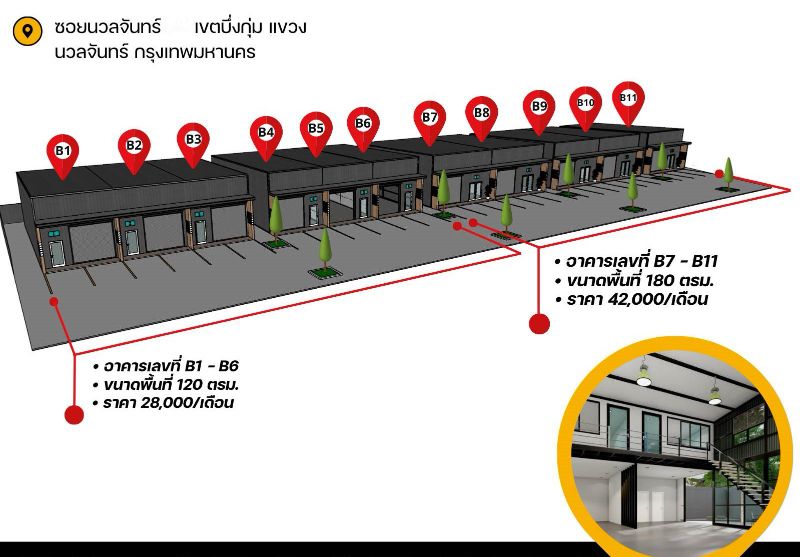 ให้เช่าอาคารโกดังพร้อมออฟฟิศย่านนวลจันทร์ ขนาด 120-180ตรม. ซอยนวลจันทร์ เขตบึงกุ่ม กรุงเทพฯ