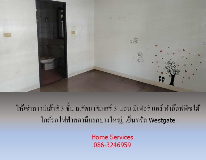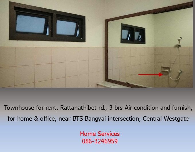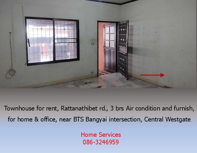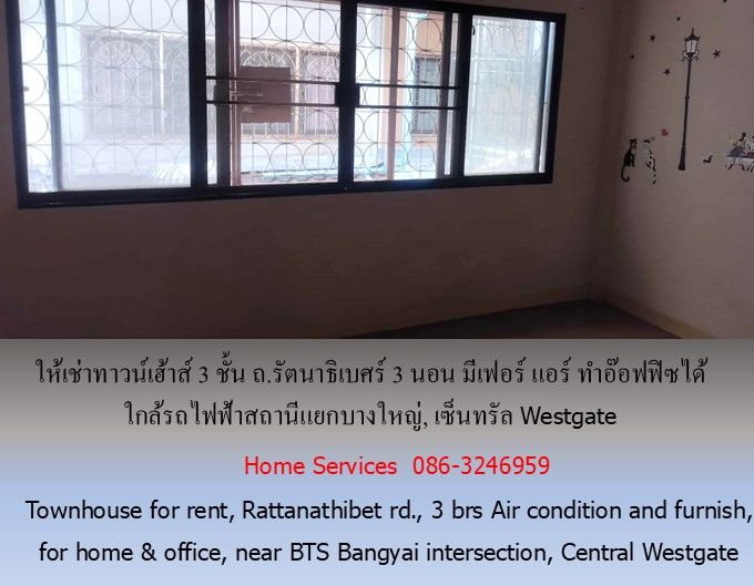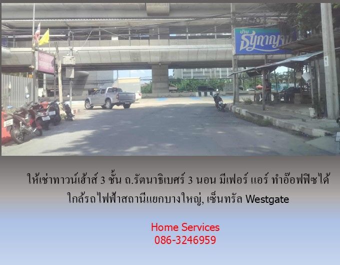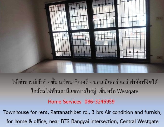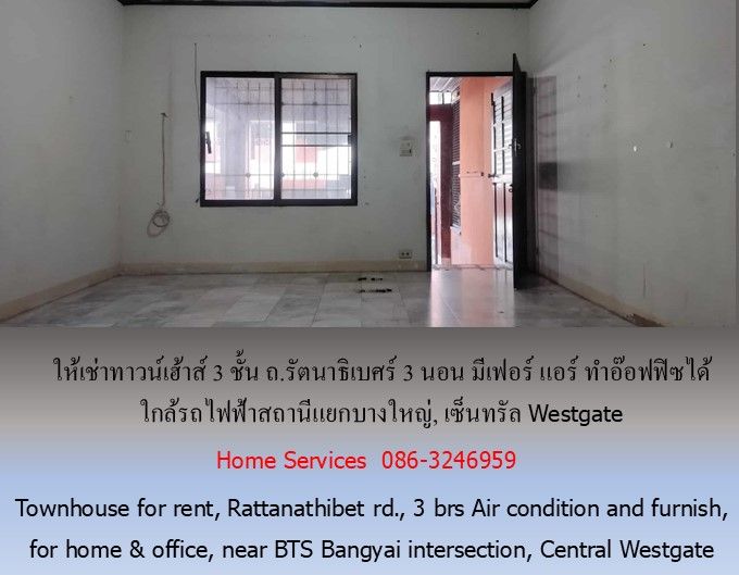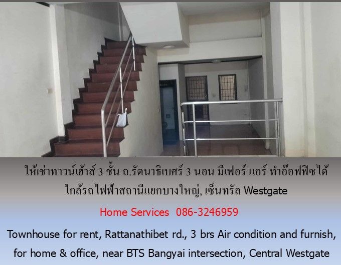 ให้เช่าทาวน์เฮ้าส์ 3 ชั้น ถ.รัตนาธิเบศร์ 3 นอน มีเฟอร์ แอร์ ทำอ๊อฟฟิซได้ ใกล้รถไฟฟ้าสถานีแยกบางใหญ่, เซ็นทรัล Westgate