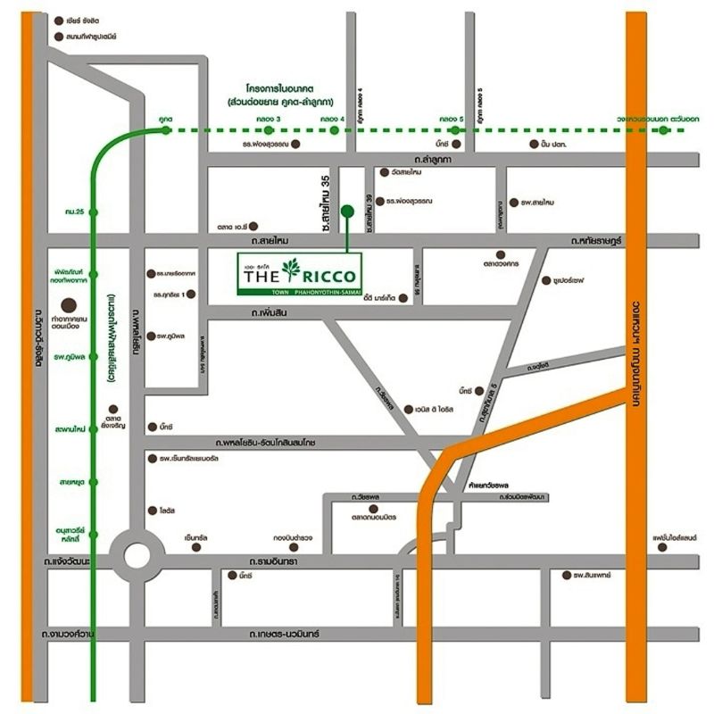 เริ่มจาก ถ.สุขาภิบาล 5 ⇒ ถ.สายไหม เลี้ยวเข้า ซ.สายไหม 35 ขับตรงไปประมาณ 550 ม.ถึงโครงการ The Ricco Town พหลโยธิน-สายไหม